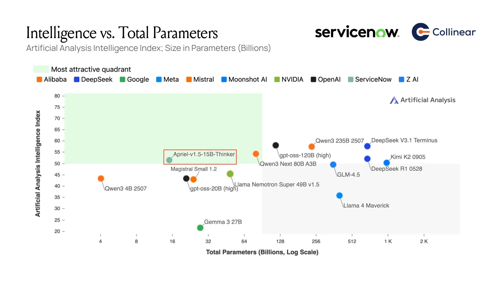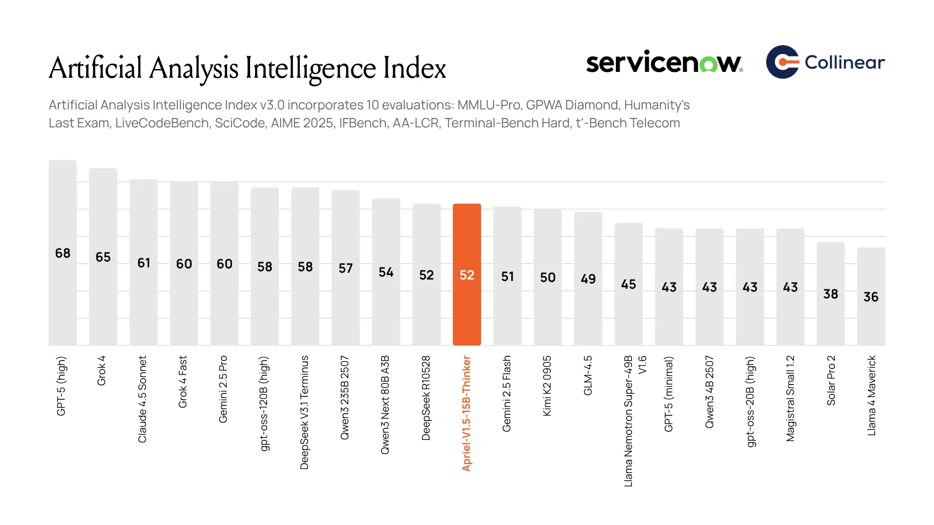 "Launch of Apriel-1.5-15B-Thinker - ServiceNow's SLM that thinks big. Multimodal reasoner delivering results on par with much larger models like DeepSeek R1m Mistral-medium and Gemini Flash 2.5 - at just one-tenth the size.